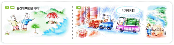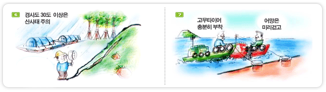 확대보기 6.경사도 30도 이상은 산사태가 주의되므로곳은 미리 둘려 보고 위험이 있는 곳은 접근을 막읍시다. / 7.선박끼리 부딪쳐 부서지지 않게 고무타이어를 충분히 부착하고 소형선박은 육지로 끌어 올리고 어망,어구는 미리 걷어 피해를 방지합시다.