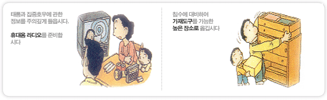 • 태풍과 집중호우에 관한 정보를 주의 깊게 들읍시다. 휴대용 라디오를 준비합시다.